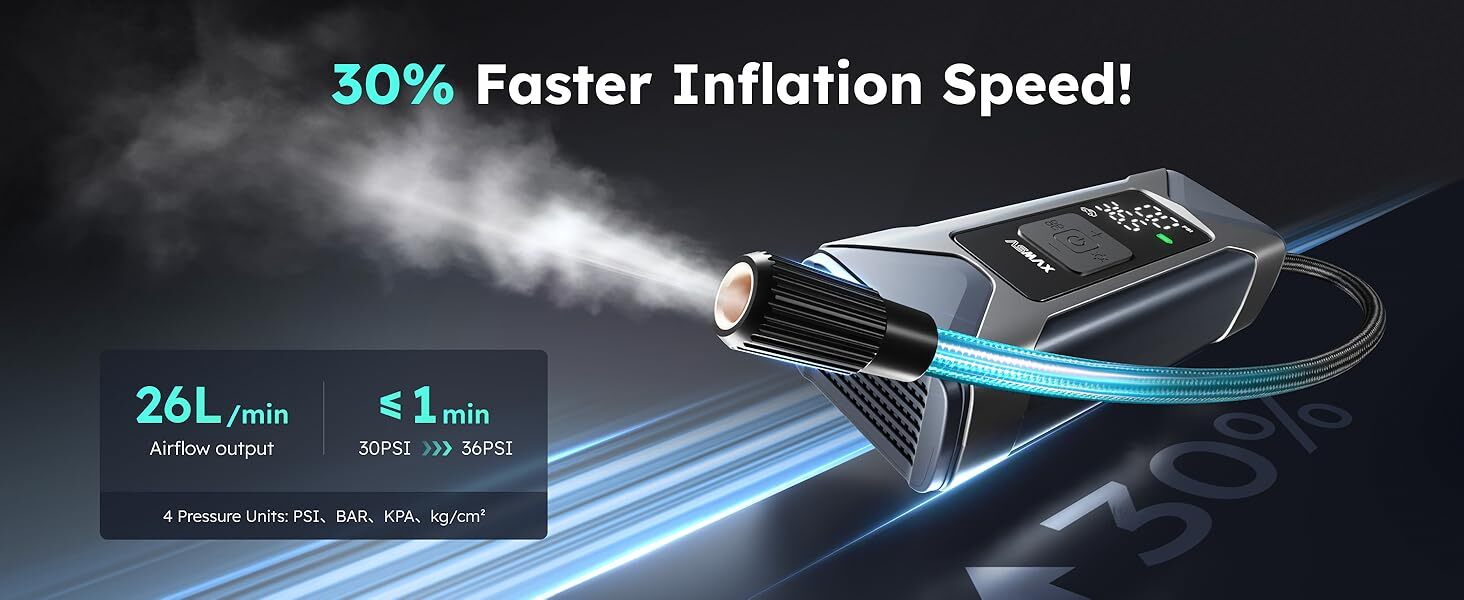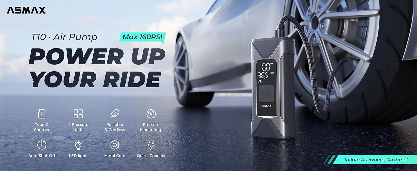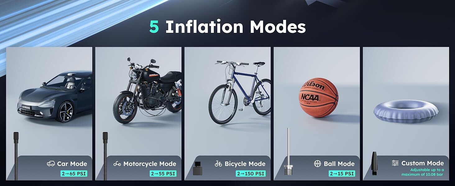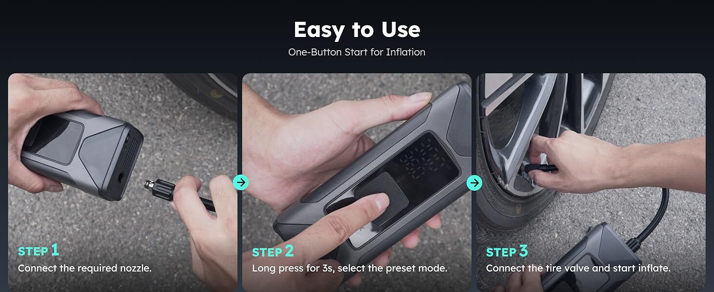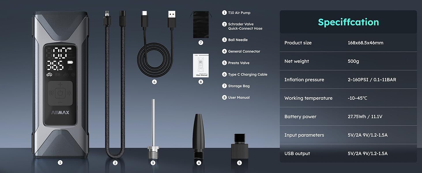 • 六合一:輪胎充氣 + 球類充氣 + 充氣玩具 + 胎壓偵測 + LED 手電筒 + 行動電源