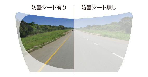 標準配備屏蔽防霧片。這樣可以防止防護罩起霧,即使在防護罩容易起霧的環境下(例如在雨中或低溫環境中行駛時)也能確保清晰的視野。