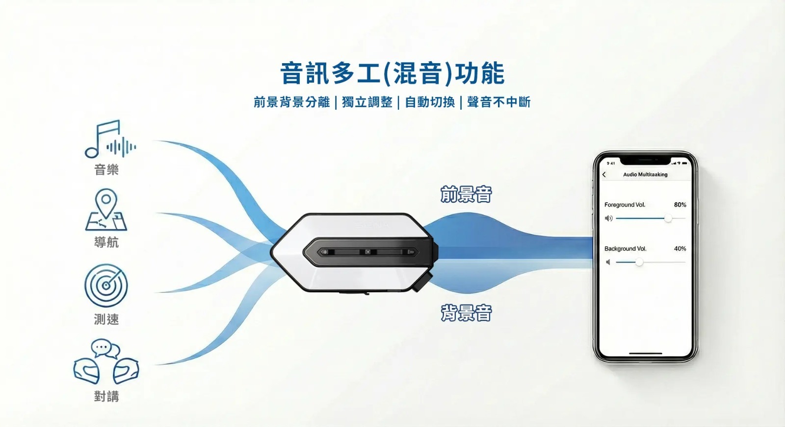 SENA 獨家的音訊多工技術,將聲音細膩分層。當你在對講時,音樂、導航或測速提醒將自動轉為背景音量,確保重要資訊不中斷、不漏接。通話、娛樂、導航三者自由切換,體驗最靈活的智慧騎乘。