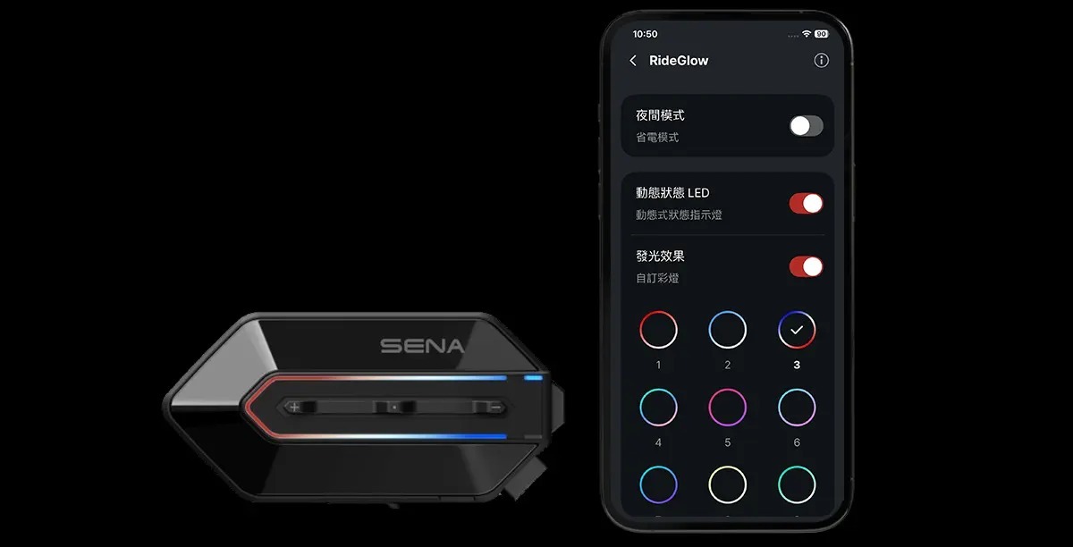 透過 SENA Motorcycles App,您可以隨心定義專屬的燈光顏色與閃爍模式,無論是要與安全帽塗裝呼應,還是追求極致的科技氛圍,R35 都能讓您的個人風格隨光而動,閃耀於每一段旅程。