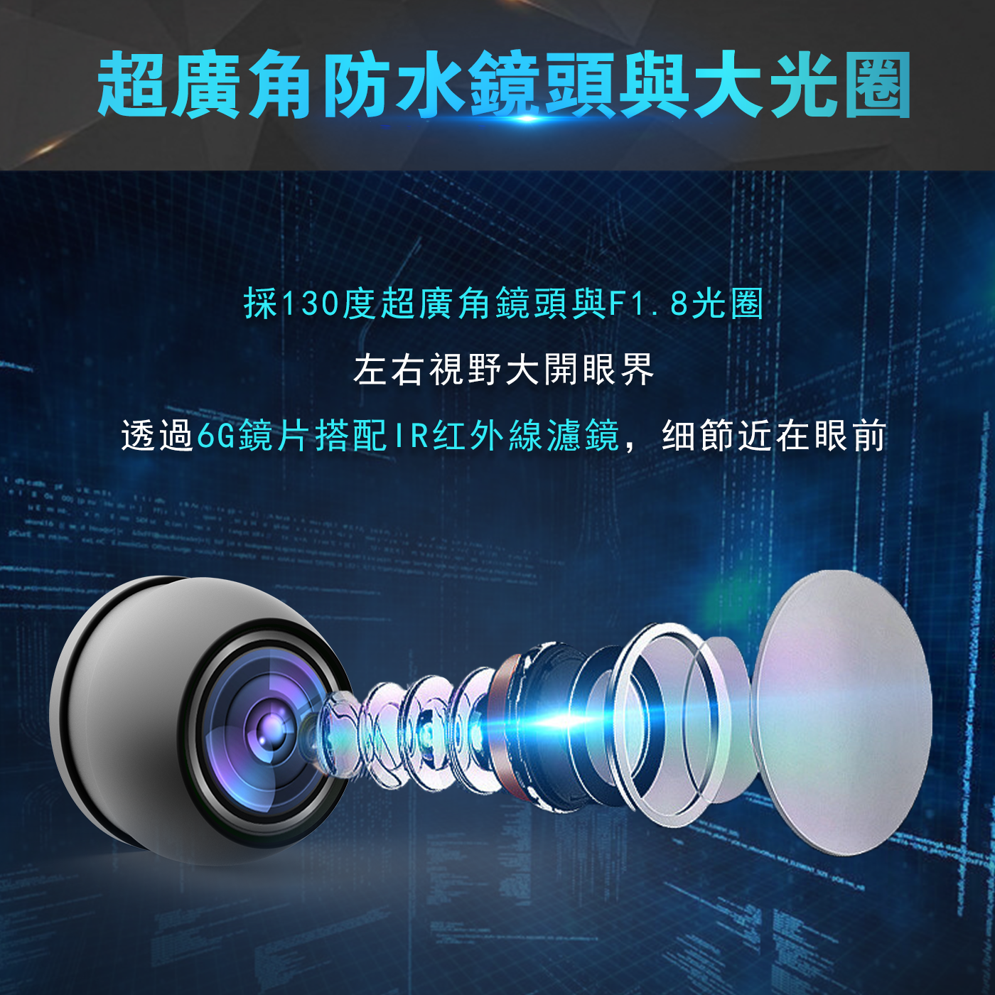 | 光圈 | F1.8大光圈與130°平面廣角 / 6G+IR濾光 |