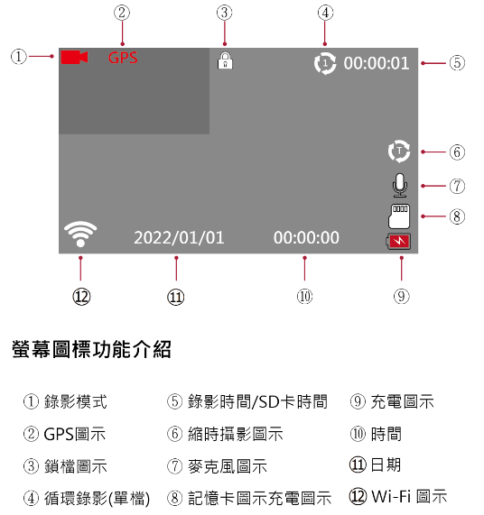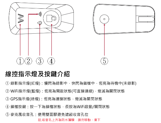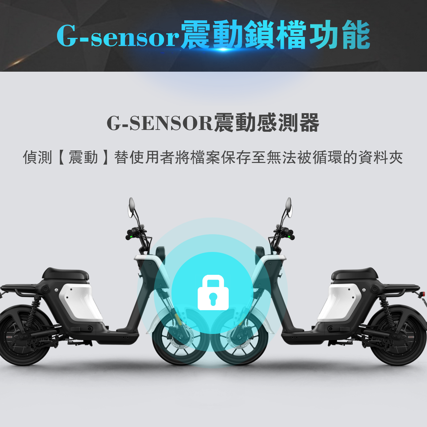 | 鎖檔功能 | 內建G-Sensor感測鎖檔,手動鎖檔 |