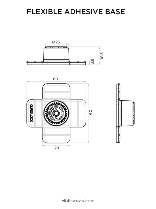 - 使用超級安全的 3M™ 粘合劑,柔性粘合劑底座有 4 個可以彎曲以匹配彎曲表面的凸片。